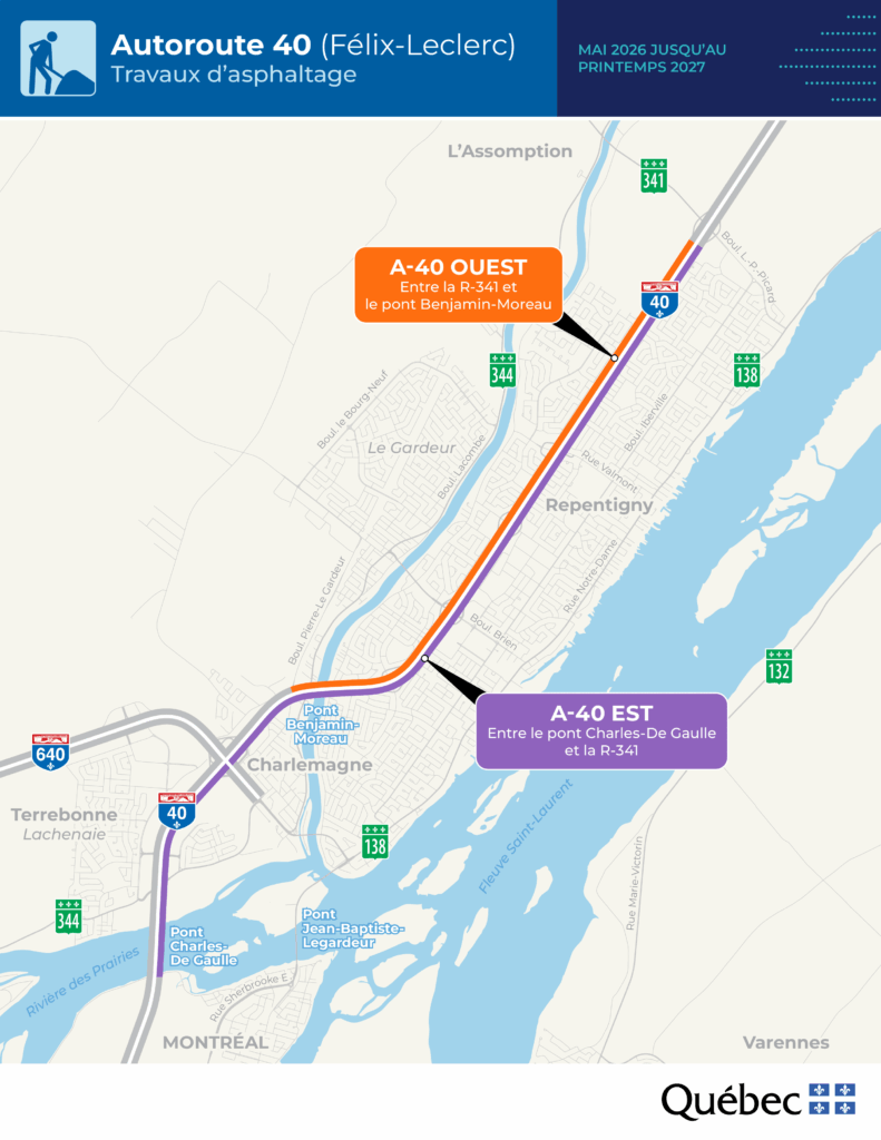 Laval, le 28 avril 2026 – Le ministère des Transports et de la Mobilité durable annonce le début des travaux d’asphaltage et de réfection de ponceaux de l’autoroute 40 (Félix‑Leclerc), en direction est, entre le pont Charles‑De Gaulle et la route 341 (montée de l’Épiphanie, boulevard Louis‑Philippe‑Picard) et en direction ouest, de la route 341 jusqu’à l’ouest du pont Benjamin‑Moreau, dès le 4 mai prochain. Ce chantier, qui se déroulera en 2026 et en 2027 (avec une pause hivernale), permettra d’améliorer la sécurité et le confort de roulement des usagers de la route.