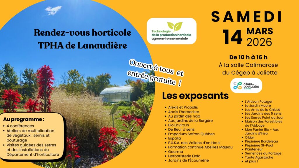 Joliette, le 23 février 2026 — Le programme Technologie de la production horticole agroenvironnementale (TPHA) du Cégep de Lanaudière à Joliette est fier d’annoncer la tenue de la deuxième édition du Rendez-vous horticole TPHA de Lanaudière, qui se déroulera le samedi 14 mars 2026, de 10 h à 16 h, à la salle Calimarose et dans plusieurs locaux du Cégep à Joliette.
