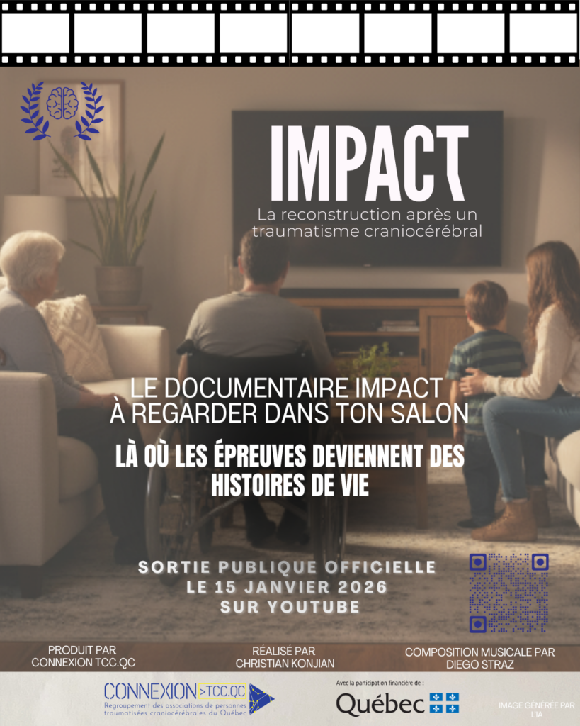 Le 15 janvier 2026, Connexion TCC.QC diffusera sur sa chaîne YouTube le documentaire “Impact : la reconstruction après un traumatisme craniocérébral”. Réalisé après deux ans de collaboration avec des personnes vivant avec un traumatisme craniocérébral (TCC), leurs proches et les associations régionales, ce film profondément humain s’inscrit dans la campagne Impact dans ton salon, qui vise à sensibiliser la population québécoise aux réalités du TCC et à briser les préjugés liés à ce handicap souvent invisible.